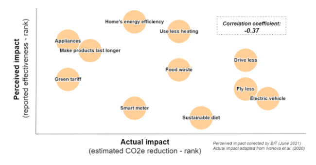 另外有一個比較少人討論的原因,那就是人們對於環保行為的成本和效益,相當無知。日前有一個調查就發現,民眾對於環保行為的效益和實際效益之間,有顯著的負相關。