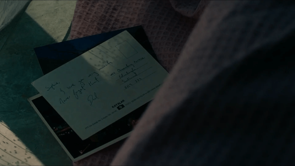 但我今天想跟大家聊的是另一個主軸,就是她父親的憂鬱。在第一次看電影的時候,沒有那麼強烈的感覺。但是,第二次看的時候,我在一個地方特別停格,看到父親寫給女兒的明信片,上面寫著 I love you very much. Never forget that。因為那個場景,父親在爆哭,加上明信片上的字,讓我覺得他在跟女兒道別,當然這道別不一定是生離死別的道別就是了。