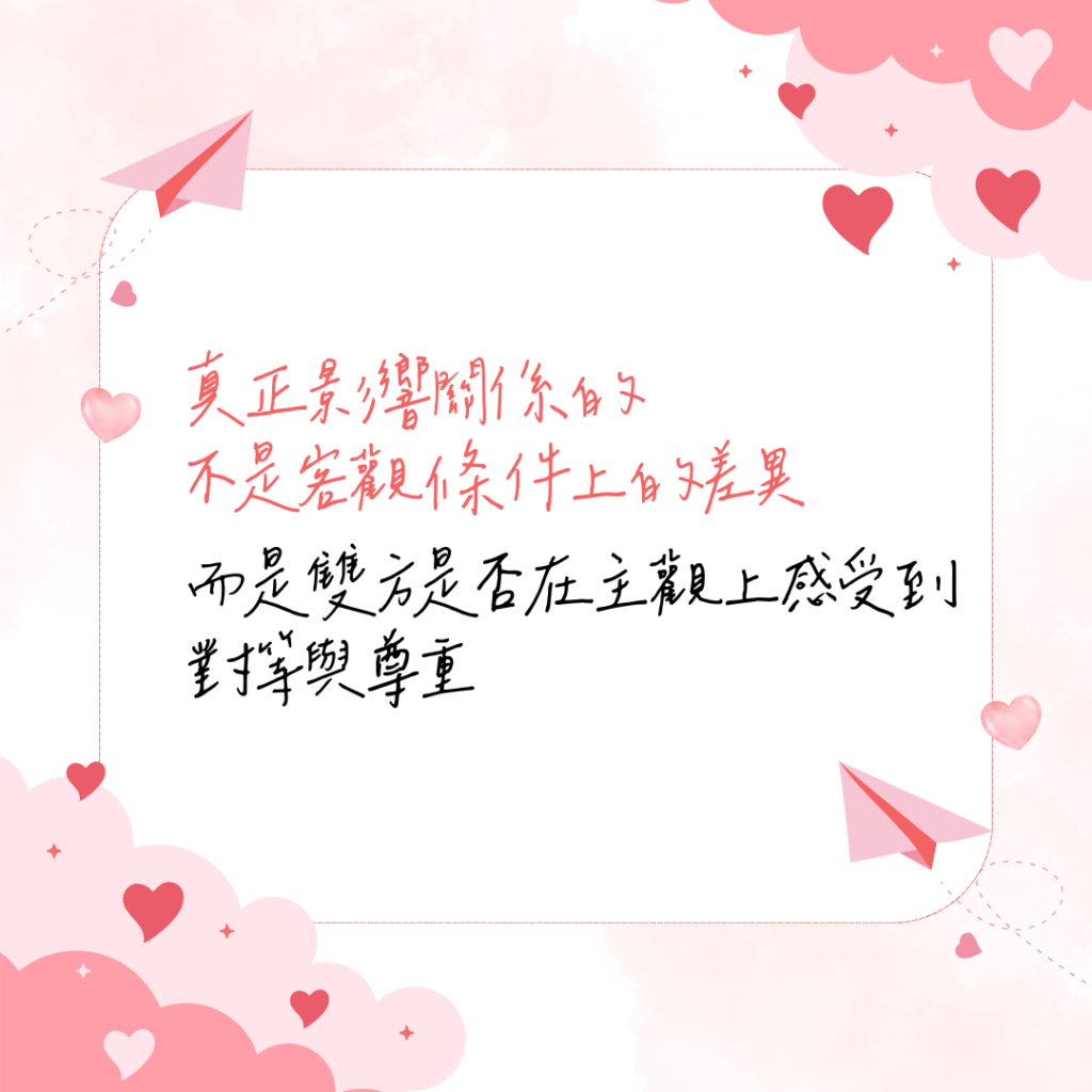 有趣的是,心理學家發現——影響關係穩定的關鍵,並不是客觀條件的差距,而是「主觀感受」的對等與否。也就是說,即便一方比另一方富有、社經地位較高,甚至教育程度較高,只要雙方都能在關係裡感受到平等、被尊重,這段關係仍然可以維持健康發展。