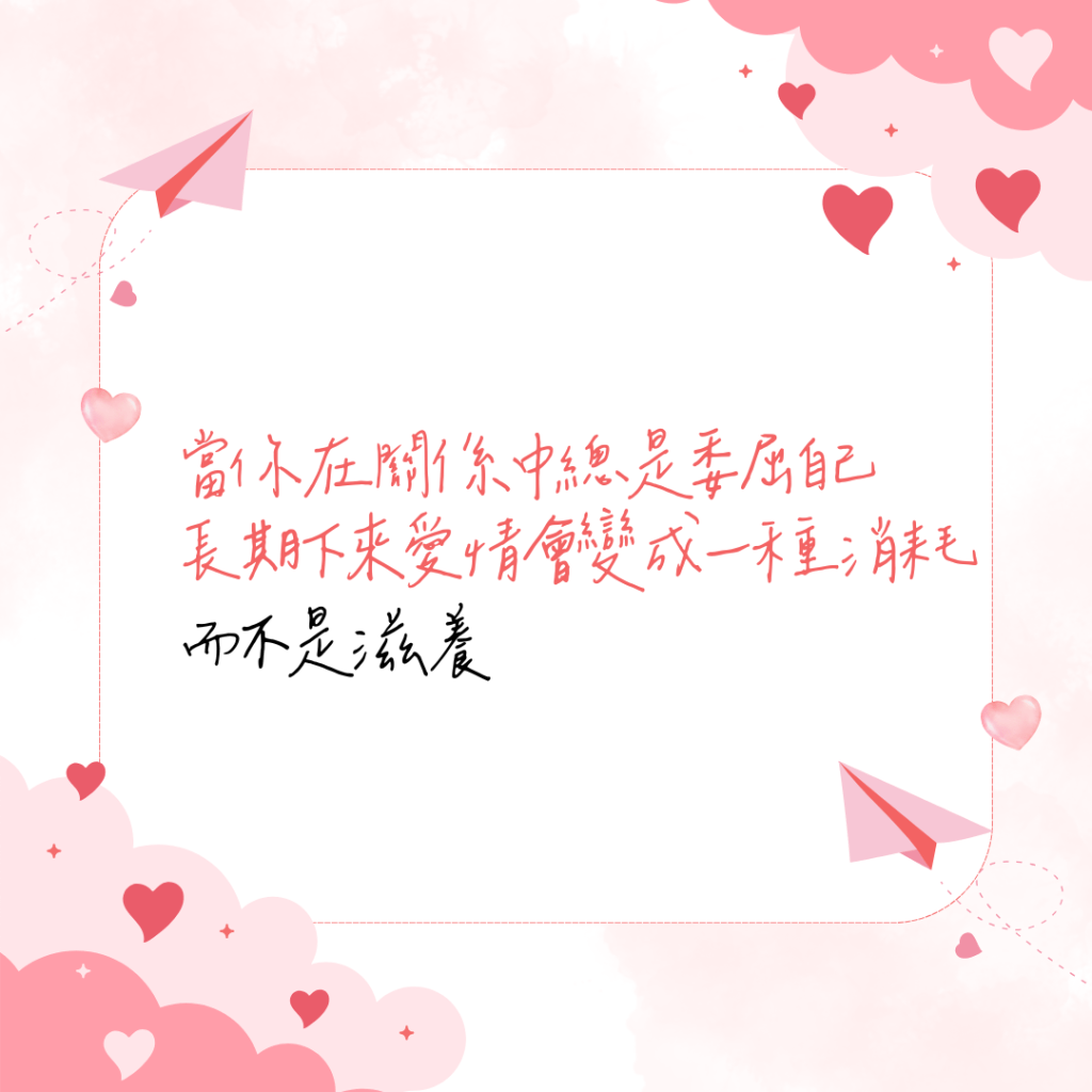 不要讓關係中的地位高低,決定你的自我價值。你是獨立的個體,不應該因為感情而忽略自己的成就與夢想。