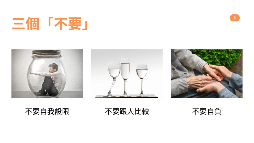 其實不管什麼年齡,跟自己比較都是比較重要的。當你不需要追求排名、績效的時候,你更該提醒自己,不要再跟別人比了。我們可以用一個見賢思齊的觀點,來看待那些在某方面比我們優秀的人,但不應該把他們當成敵人。 - 不要以為自己很了不起